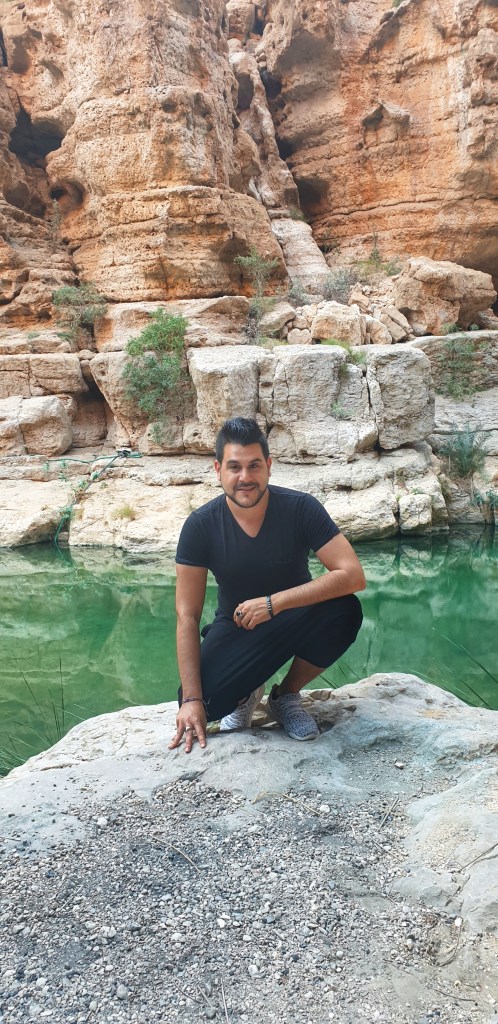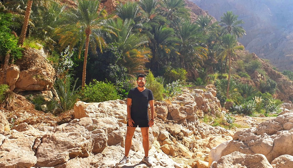En este momento empieza el recorrido a pie por un sendero de piedras entre palmeras y pequeñas cascadas de agua dulce. Es un rincón único en Omán y que llama muchísimo la atención por sus aguas de color turquesa.