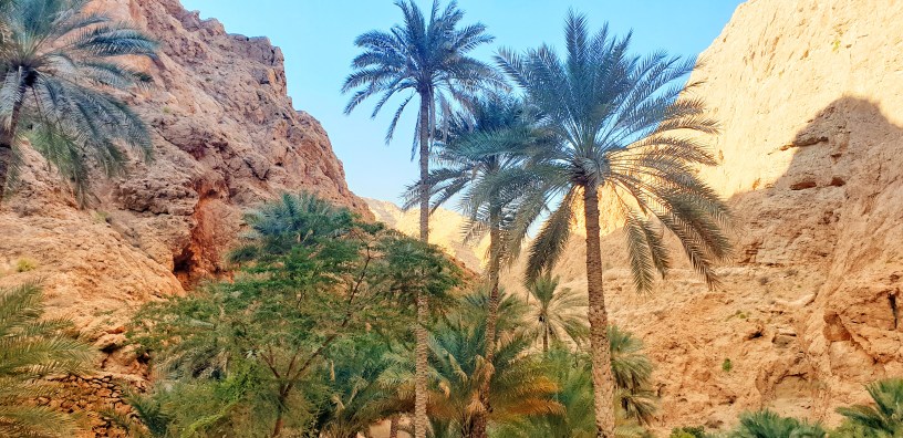En este momento empieza el recorrido a pie por un sendero de piedras entre palmeras y pequeñas cascadas de agua dulce. Es un rincón único en Omán y que llama muchísimo la atención por sus aguas de color turquesa.