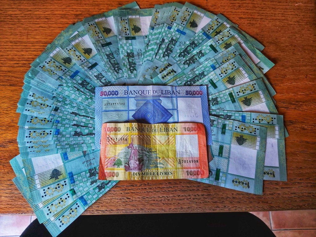 Deberás de cambiar la divisa en el mercado negro. Durante los días que visité el Líbano obtuve un tipo de cambio de 1 USD = 88.000 LBP. Llévate una mochila donde guardar los billetes, ya que en una cartera o monedero normal no van a entrar!
