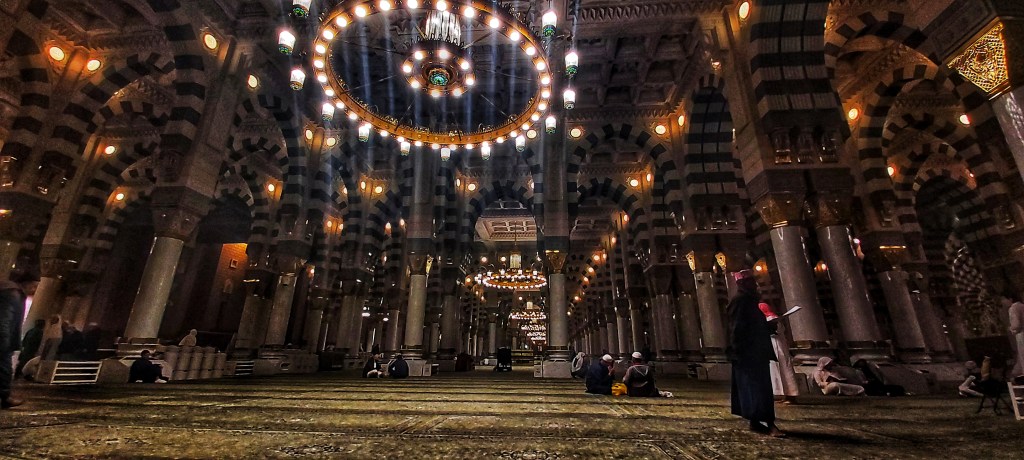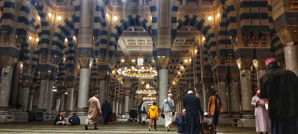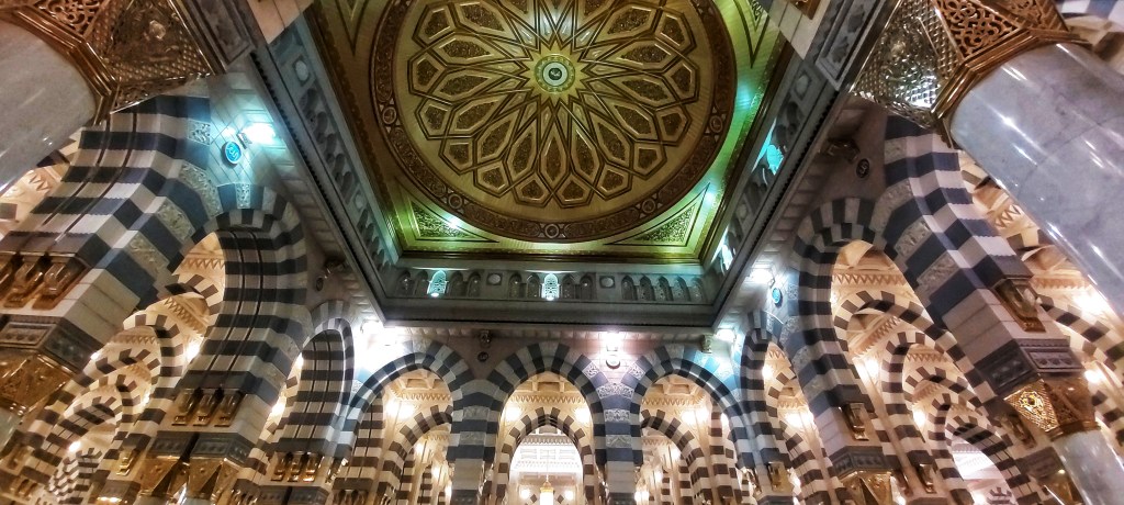 Interior de la Mezquita del Profeta Muhammad en Medina